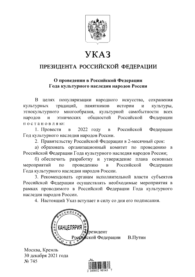 2022 год объявлен Годом народного искусства и культурного наследия